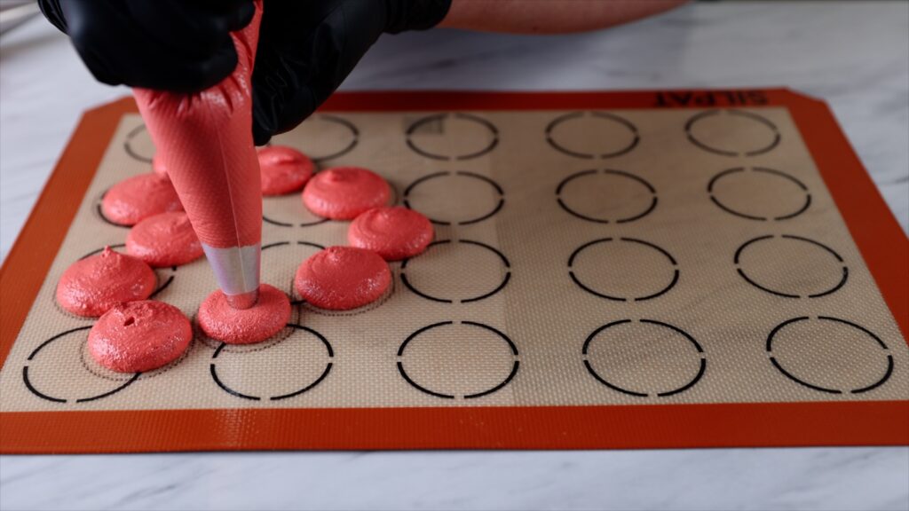 - Place the template under the baking mat and pipe using a bag with a round tip.