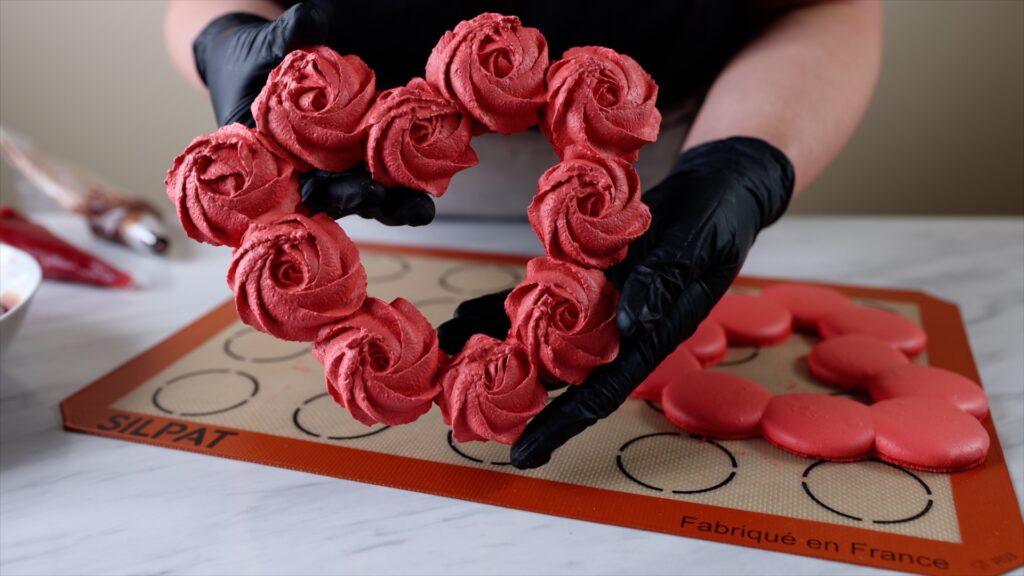 Step Four. Bake macaron heart-shaped shells. I used my basic French meringue recipe for the shells. If you like to use Italian meringue, see detailed instructions in a separate post. I also have an online video lesson on how to make macaron shells using the No Rest method. The recipe in the lesson has less sugar than my basic French meringue recipe. You can check that too. However, the method and meringue you are using for regular macaron shells, use that to make Valentine’s Macaron Heart Cake. I have a video on how to make Rosette Macaron shells. The same rules will apply to make this cake. One part of the macaronage needs to be undermined, and the other part regular (should flow like “lava” from the spatula). If you never made textured macarons, watch my videos on my YouTube Channel.