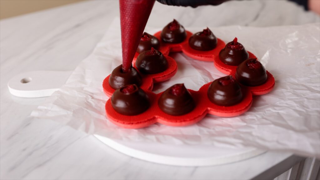 Step Five. Assemble the cake. This is the best part and should be done a day or two before you enjoy this cake. When you have baked shells, place the ganache into a pastry bag with a round tip. In the bag with raspberry confit, cut a little tip, and it is ready for filling. Place a round heart with the flat side up on the countertop and pipe the ganache. In the center of the ganache pipe, confit. Sandwich cake with a rosette heart and press lightly. Place the cake into an airtight container and refrigerate. Macaron cake needs to ” mature” before you can enjoy it. This Valentine’s Macaron Heart Cake is the perfect dessert that can be and should be made ahead of time for Valentine’s Day.